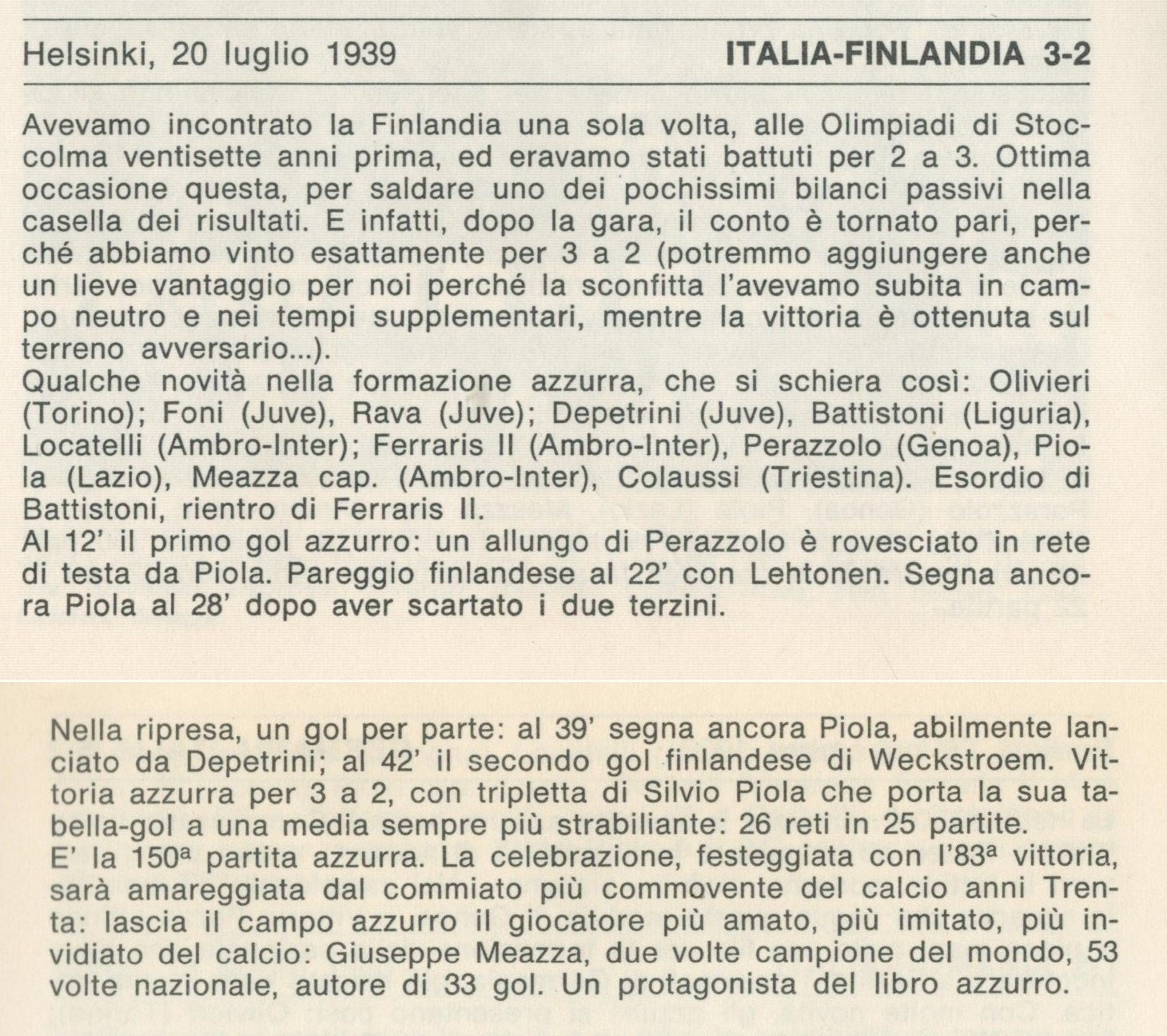 Finland 2-Italy 3 (Aatos Lehtonen 22, Kurt Weckström 87 / Silvio Piola