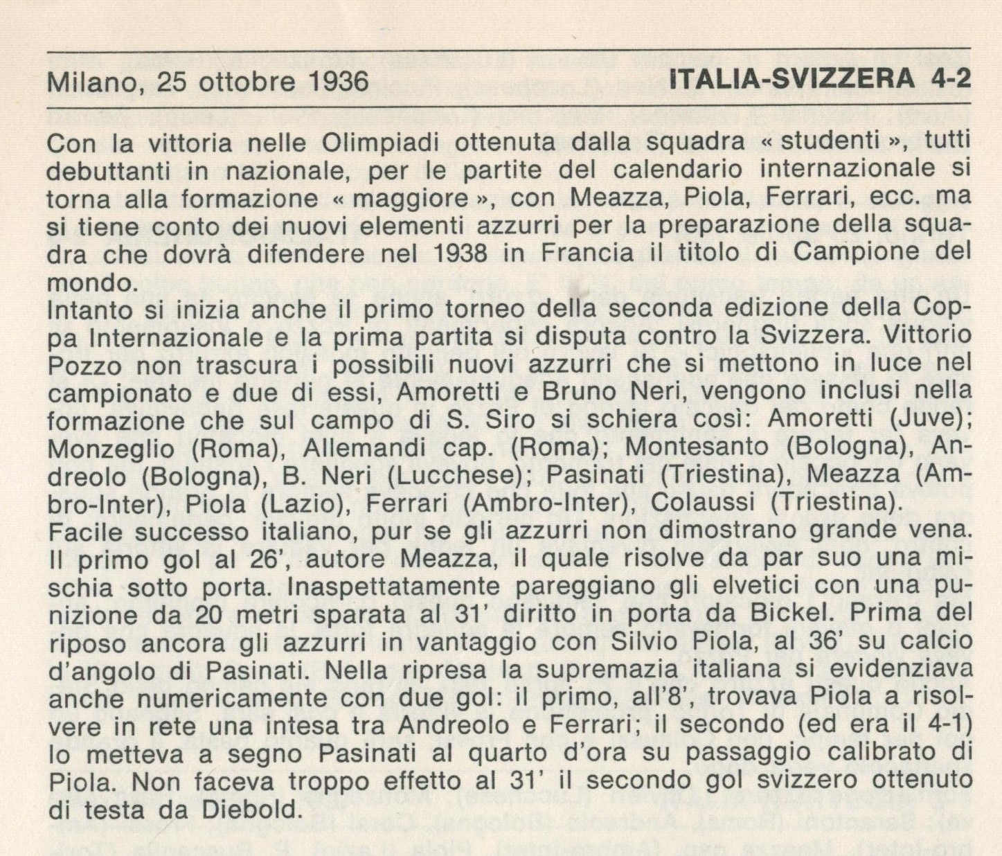 October 25, 1936, Dr. Gerö Cup, Milano, Italy 4-Switzerland 2 (Giuseppe Meazza 26, Silvio Piola 37, 53, Piero